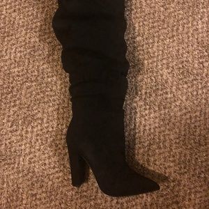 These boots go up just past the knee. They are really comfortable I just realized that I do not know how to walk in heels and have decided that I do not want to. Second photo proves how little they have been worn!
