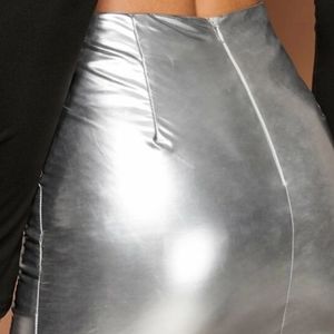 METALLIC SKIRT. ZIPPER ON THE BACK OF THE SKIRT. I AM WEARING THE SIZE SMALL. FOR REFERENCE I'M A 26-27 IN JEANS. Please ask for measurements if you are unaware of your size.
