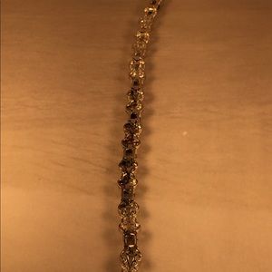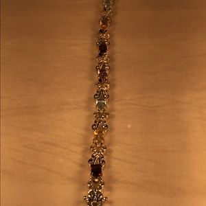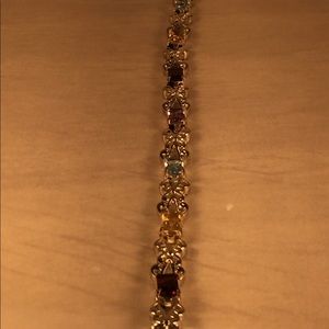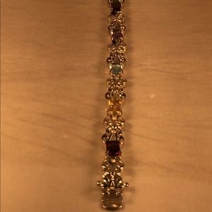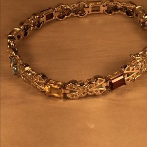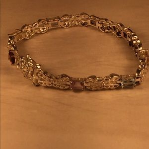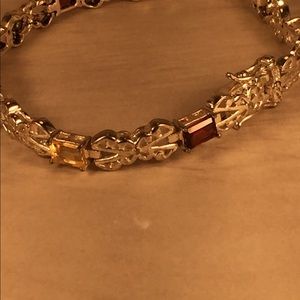 Gorgeous sterling silver .925 multi-stone bracelet composed of garnet, citrine, blue topaz, and amethyst stones. A really nice clasp with a tongue insert and a double-latch system safely secures the bracelet. This is a used item that shows surface scratches with minimal blemishes or tarnish and wear consistent with previous ownership and use.