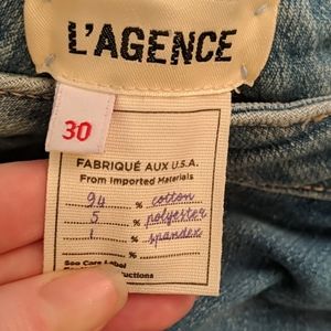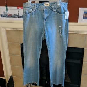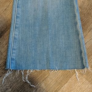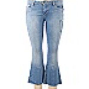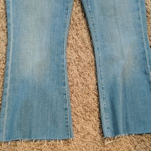 Designer, Cotton, acid wash, bell bottom jeans, cropped at the ankle, labeled as a size 30 (fits 8-10)