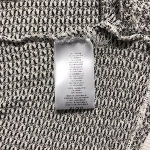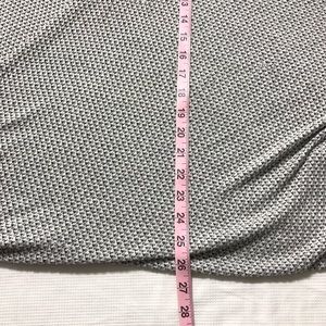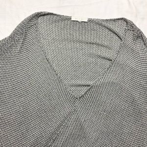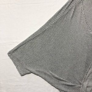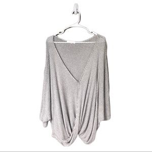 In good used condition Anthropologie wrap top by eri + ali in an unknown size. Missing tag size. Dolman sleeves. Has a snap up button on the front for closure. Material is stretchy. Shows only minimal sign of wear due to normal wear. May have minor snag but not noticeable. Please see all photos.