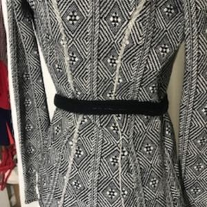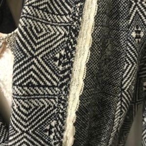 Black and white knit sweater from Anthropologie with black lace trimmed wrap.