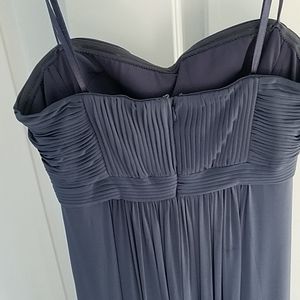 Grey-purple color. Floor length. Strapless. Worn once for a wedding.