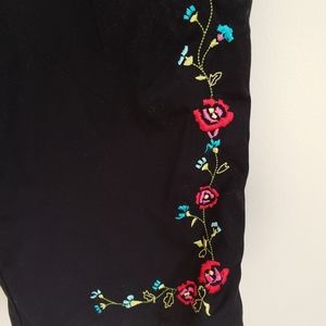 White Stag petite black pants, floral embroidery, size 12, side pockets, 100%cotton, zipper and button that is not visible outside. Tiny stain near seam of left pocket (see 1st picture) that is barely visible. In great condition.