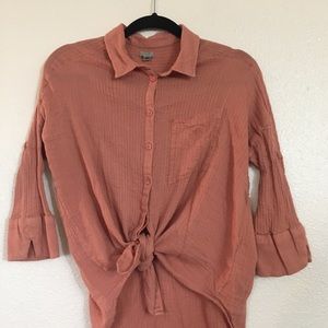 Orange button down collared shirt from Ecote, originally bought at Urban Outfitters. 3/4 length sleeve. Lightweight material. Looks cute tied at the bottom with high waisted bottoms! Size medium.
