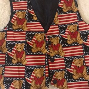 This teddy bear patriotic vest is super cute. It has three buttons and adjustable tie on the back. Pre-owned. Great condition. One size.