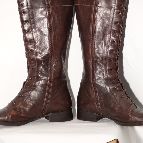 Brown leather lace up boots by Via Spiga Italy. Size 7 1/2-56. Vibram Soles. Zips on the inner leg. Some color loss to the inner side of one boot (not sure what from) other wear is VERY MINOR.
