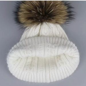Ivory Angora Fur Pompom Cable Knit Beanie