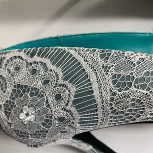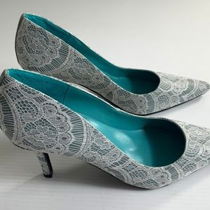 Shoes of Prey Women's Shoes Heels Pumps Size 39.5 Lace Over Gray Wedding Dressy Pointed Toe. A couple of areas where there is very slightly darker as pictured. Heel measures about 3" high.