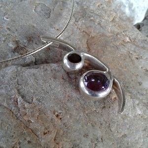 Sterling Silver Modern Swirl Design pendant with Amethyst and Garnet faceted gemstones, on a 16" Sterling round omega chain with lobster claw clasp...