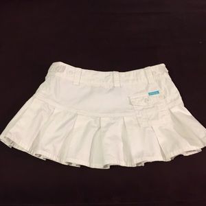 All white. Belt loops with one back pocket that buttons. Side zipped with buttons on each side to adjust size. Measurements: 30” at waistline, 34” at hips, 12” long.