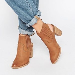 Western-inspired topstitching details a weathered-leather bootie styled with a breezy back cutout and lifted by a stacked block heel.