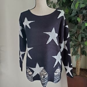 New! Black Knit Star Distressed Hem Sweater