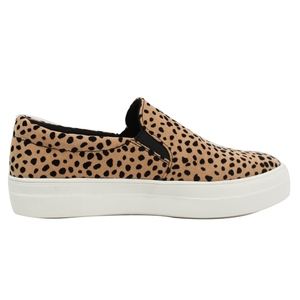 Leopard faux suede elastic side 1 1/4" white rudder slip on shoes. Model is a size 7 and a size 7 fits her perfectly.