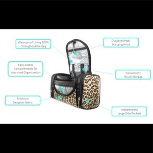 Waterproof lined hanging cosmetic bag perfect for traveling, gym or college. Large and spacious to accommodate all your brushes, makeup and toiletries.