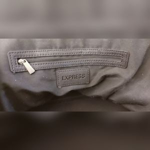 Black, Express, chevron quilted satchel has a zip closure with one large compartment inside. Two small pockets on one side. One larger zippered pocket on the other side.