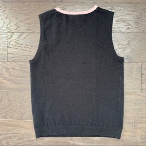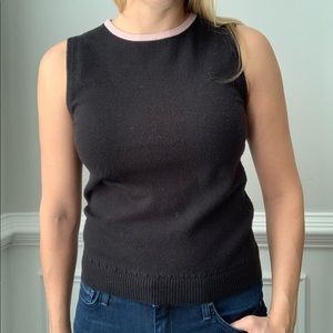 Black, very soft sweater vest with pink collar detail. Small hole details around bottom hem.