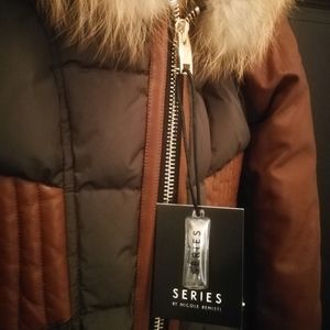Design details: quilted design, leather paneling and sleeves, leather bib with rib-knit collar, fur trimmed and zippered slits at the side seams