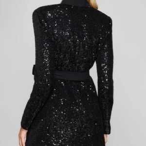 Stun at your next RSVP in this wow-inducing blazer evoking a luxe sophistication. Features an allover sequin longline design with proportionate lapels and a removable self-tie belt. Standard welt pocketing. Covered button-snap closure.
