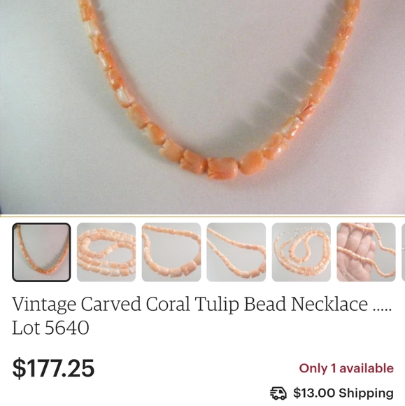 Vintage 80s, elegant graduated carved genuine coral necklace, the corals are in the shape of tulips/floral buds graduated from 0.4cm -0.8 cm. The colour is best described as "pink salmon" with hues of white and "angel skin". The corals on the necklace are in very good condition, no chipped or scratched corals, the carving is beautiful and precise. Please note that the barrel clasp present with distressed gold platening, consistent with the age and not very noticeable when worn, reasonably priced