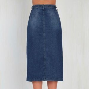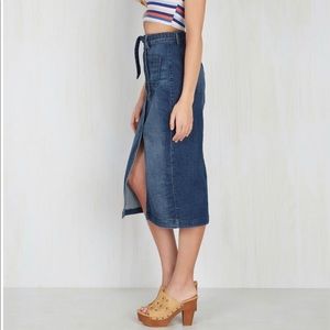 Lovely denim skirt with matching sash, front pockets, and silver buttons. Mid-wash denim with recently-retro appeal. Mid length well below knees: approx 32” long.