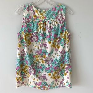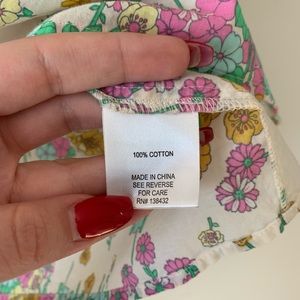 in great condition! Pretty pastel floral print all over. Very lightweight material. Pleated pintuck detail around the neck with covered buttons and crochet lace details. No rips, stains, or holes!