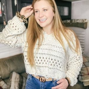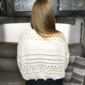 This oversized super-soft chenille open-knit sweater is the perfect cream color to really pull all of your outfits together. Great for lounging around the house or going out on the town. Please feel free to ask any questions!
