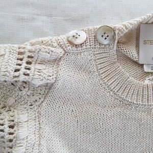 LEAVING MY CLOSET TODAY. Very high quality hand-knit sweater by designer Stella Pardo. You can just feel the quality when you touch it - the knit is a fine gauge, compact and dense. Substantial, 100% organic cotton. Hand wash but can dry clean. Size small is smallest.