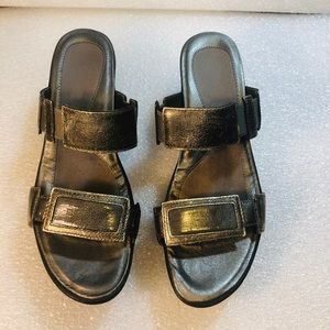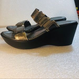 These wedge sandals from Naot are cute and fantastically comfortable! The show has metallic straps, a 3 inch wedge (sole is 1 inch), and are size 39. The shoes definitely show signs of wear on the straps, but they still have lots of life left :) Naot is known for its high quality shoes, and these wedges are a great example of that!