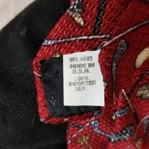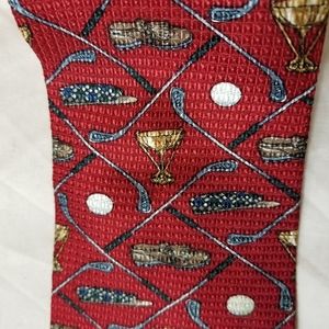 Dark red ground with multi golf print. The silk is textured. 4" x 59".