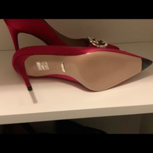 Hot pink satin Gucci heel with crystal Gucci emblem. Never worn. Dust bag included. No box included.