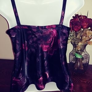 XS Black camisol with burgundy floral print and mesh neckline. Like new