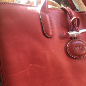 Longchamp Heritage Roseau in rust calve leather. Purchased by me in August at the Longchamp store. Can provide receipt if needed. Carried for 4 months, gently! Silver tone hardware. Tan lining with slip pockets and zipper pocket. Protective feet. Comes with hardware cleaning cloth and care instructions, sleeper bag included. Larger size: 10" tall, 13.5" wide, 4.5" deep. Handles 4.5", strap 18". Shoulder bag unless smaller frame person can carry cross body. Light scratches. Inside perfect!