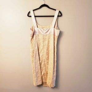 Excellent condition, only worn once to a wedding. Very minor pull at top of jacket (last picture). Otherwise, no holes, no stains. The dress is a lighter champagne color (unfortunately my camera makes it look more yellow)