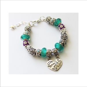 Alloy metal mother daughter bracelet with charms and spacers. Teal blue and purple add to the allure of this adjustable piece. Perfect for your Mom, your daughter or yourself