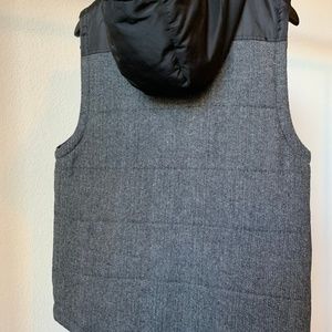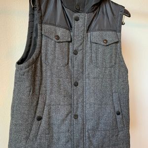 Light weight button up vest with hoodie. Silk black accents and blended grey wool make for a stylish look when pairing with a black under shirt and black jeans.