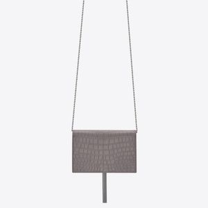 CLASSIC SAINT LAURENT CHAIN WALLET IN CROCODILE EMBOSSED LEATHER WITH REMOVABLE LEATHER AND CHAIN SHOULDER STRAP, INTERLOCKING METAL YSL SIGNATURE AND METAL CHAIN TASSEL.