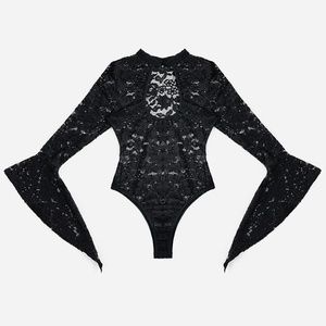 Black Sheer Floral lace Bell Sleeve Bodysuit