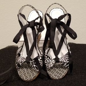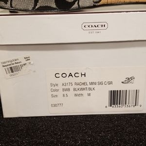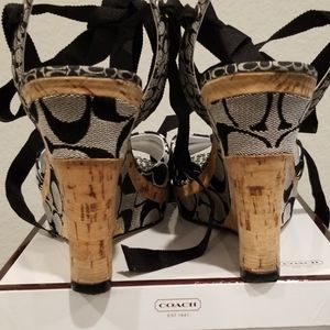 Authentic Coach Rachel wedge sandals with poppies and Coach signature CC in black and white. They are in LNC and are a size 8.5M. Originally purchased at Bloomingdales. Worn only 3 times. Come with box. See pictures for all wear and design detailing.