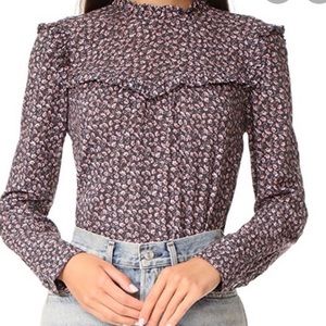 A ruffled La Vie Rebecca Taylor blouse with a vintage-inspired print. Long sleeves and button cuffs. Button placket in back. Color: Washed Black Combo