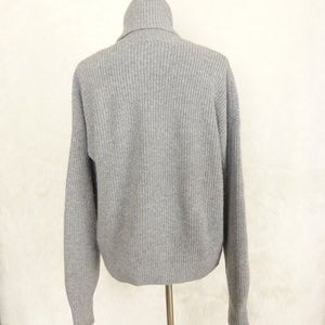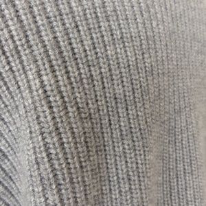 This is a cozy, over-sized, chunky knit turtleneck grey sweater from Tory Burch. Dropped shoulders. Textured ribbed knit. Overall slight fuzzy cuddly fabric. 70% wool, 30% cashmere chunky knit. No flaws. Approx. measurements: 23 in armpit to armpit, 23 in length (2695)