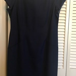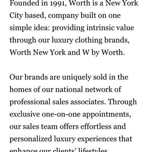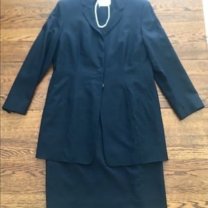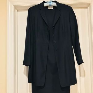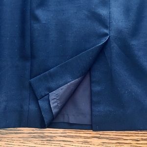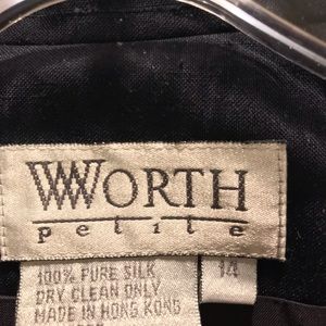 100% pure silk dress and jacket made by prestigious company Worth New York. Color is navy. Dress is fitted with back hidden zipper and kick pleat. Jacket has placket that covers (4) buttons when buttoned. Very well made, classic and elegant dress and jacket ensemble. Price is firm.