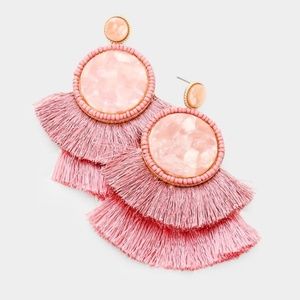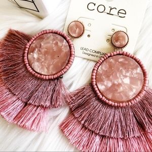 Bead Embellished Round Celluloid Acetate Tassel Earrings Pink. Post back. 2.75” x 3.25”. Brand New with tags. Tassel fan earrings.
