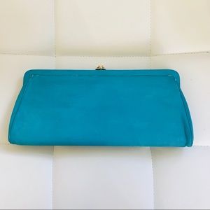 Vintage frame clutch bag. Raw silk like fabric in robins egg blue. Snap goldtone closure. Navy lining with one pocket inside. Some separation of fabric from frame near seams, see photos for white spots. Slight variation in blue color. Not noticeable when carried. Good vintage condition.