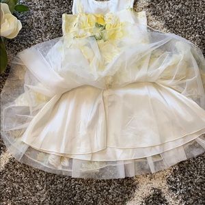 This dress is stunning. Size 8 girls was worn only one time and no signs of use. Has a gorgeous pearl and clear rhinestone neckline. Has three layers to make your little girl feel like a princess. Great for Easter or special occasions.