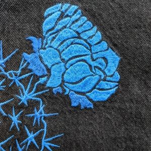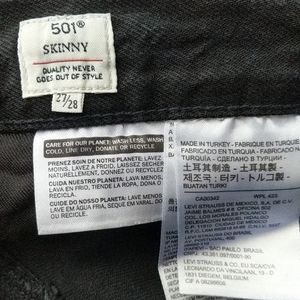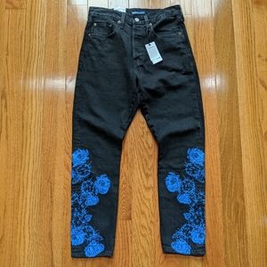 Lightly faded black '501' skinny jeans by Levi's Made & Crafted. High rise with a button fly. Selvedge denim. Bright blue floral embroidery on the legs. 100% cotton. Size 27. New with tags.