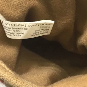 Super comfy and SUPER CUTE bootie slippers. Tan with an orange, brown, white, and green geometric pattern. Ties. Rubber soles. In very good condition, with light wear.