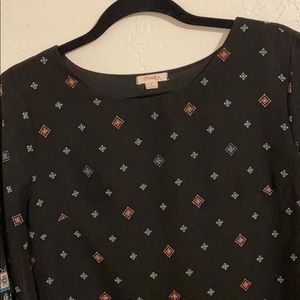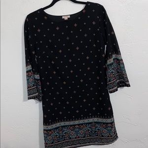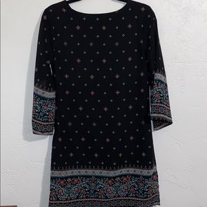 Pinky Dress, size S, black and floral print polyester, semi sheer 3/4 flowing sleeves, side zipper, fully lined. Excellent condition. Armpit to armpit measures 18”, length from shoulder to hem is 32”.