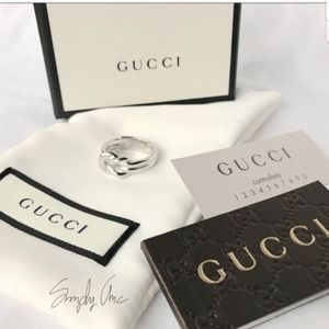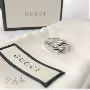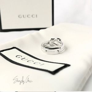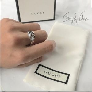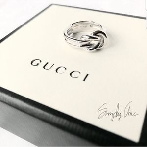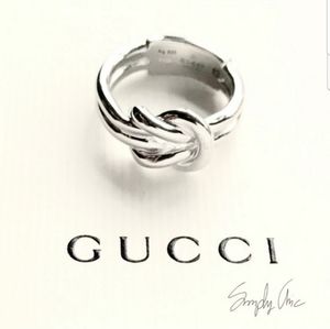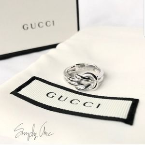 Time to tie that look together with this Gucci exquisite ring. This sterling silver band features a Piccolo knot design that comes together nicely on top. A "Gucci" bar is place at the underside of the band so everyone knows that you're a Gucci Girl.