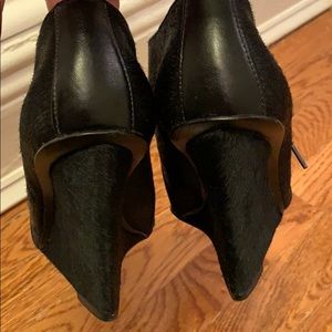 Black cow hair leather booties in this fun style. Wedge heel for comfort.